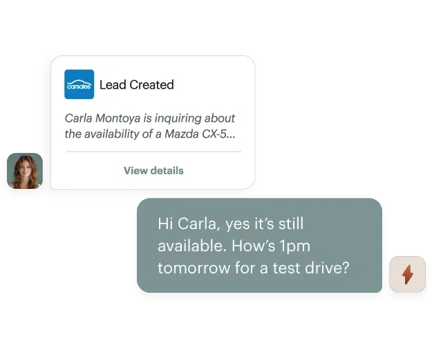 Be the first to respond, ask the right questions, and engage customers with natural, human-like conversations. From booking appointments to scheduling test drives, our AI handles it all seamlessly.